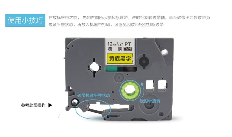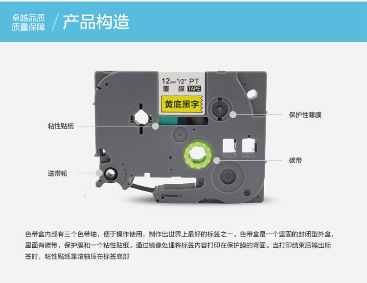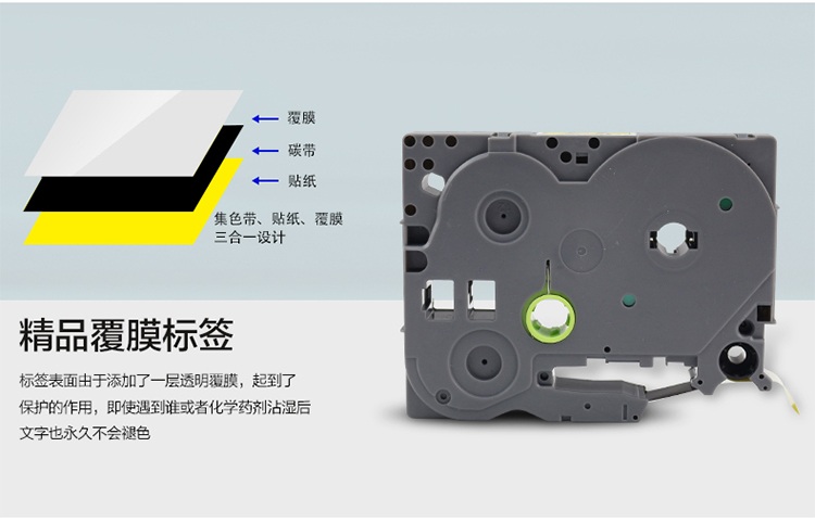 TZ系列兼容色带采用国际最新的复合工艺:“强力贴合覆膜技术”,使得PET材质通过强力复合机覆上一层薄膜,改良了传统覆膜标签带覆膜不紧密所造成的标签局部材质分离的弊端,同时将打印的标签内容都打印在保护薄膜的下面,保持了覆膜标签带防水、防油污、耐高温、耐腐蚀、耐磨损等特点